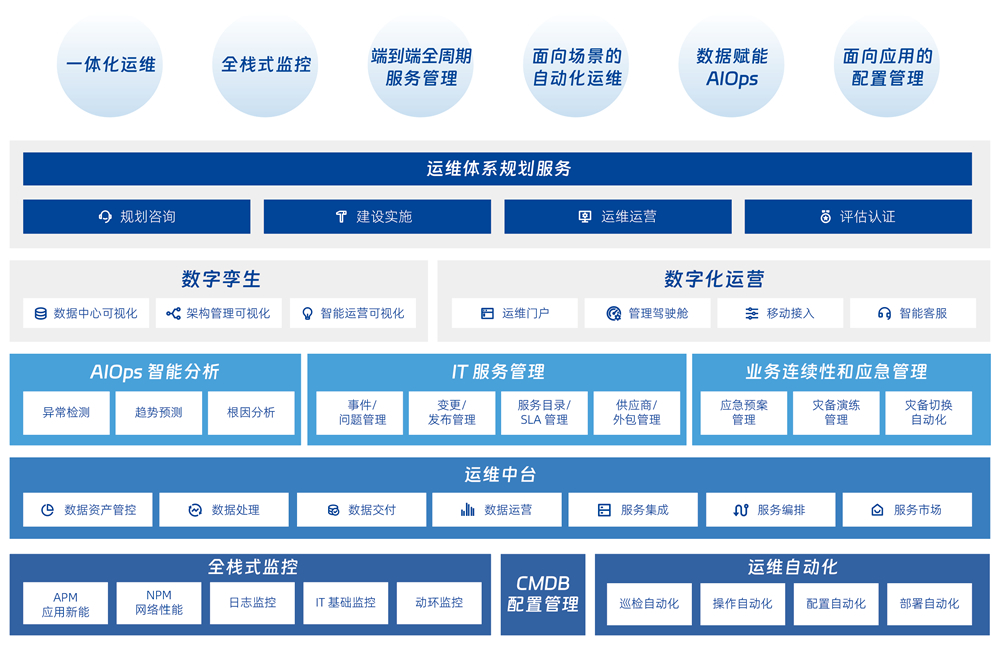 针对数字化时代对运维管理的需求,自主研发的“监管控析”一体化智能运维解决方案。平台以客户和业务场景为导向,通过全业务的数据和流程整合,同时支持传统 IT 架构和云技术架构的“双态 IT”运维,实现可视化、场景化、自动化、精细化的智能运营管理,提升用户体验及运营效率,助力内外部生态的数字协同和价值创造。